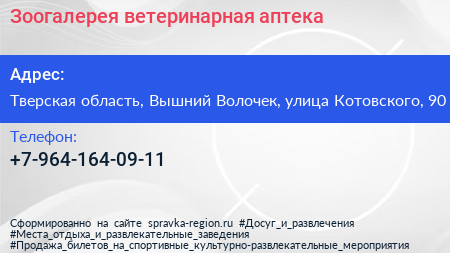 Зоогалерея, ветеринарная аптека по адресу Тверская область, Вышний Волочек, улица Котовского, 90 в дальнейшем Организация, размещена в следующих категориях: