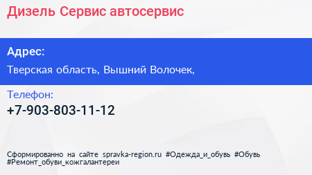 Дизель-Сервис, автосервис по адресу Тверская область, Вышний Волочек, в дальнейшем Организация, размещена в следующих категориях: