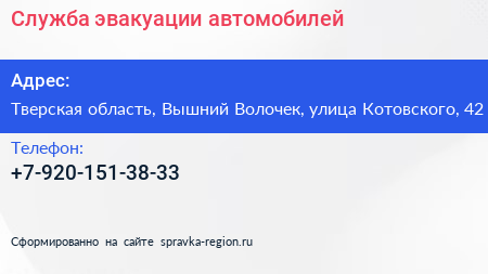 Служба эвакуации автомобилей по адресу Тверская область, Вышний Волочек, улица Котовского, 42 в дальнейшем Организация, размещена в следующих категориях: