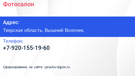 Фотосалон по адресу Тверская область, Вышний Волочек, в дальнейшем Организация, размещена в следующих категориях: