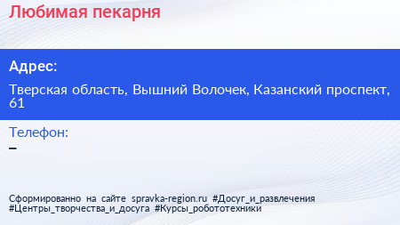 Любимая, пекарня по адресу Тверская область, Вышний Волочек, Казанский проспект, 61 в дальнейшем Организация, размещена в следующих категориях: