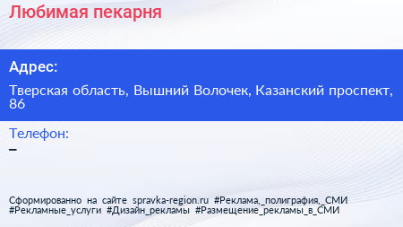 Любимая, пекарня по адресу Тверская область, Вышний Волочек, Казанский проспект, 86 в дальнейшем Организация, размещена в следующих категориях: