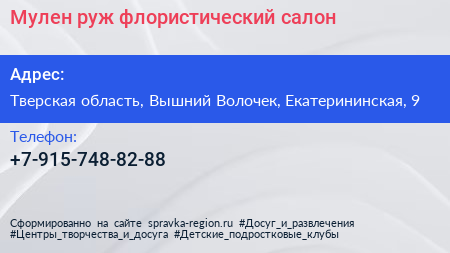 Мулен руж, флористический салон по адресу Тверская область, Вышний Волочек, Екатерининская, 9 в дальнейшем Организация, размещена в следующих категориях: