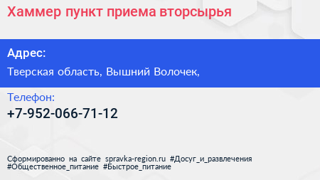 Хаммер, пункт приема вторсырья по адресу Тверская область, Вышний Волочек, в дальнейшем Организация, размещена в следующих категориях: