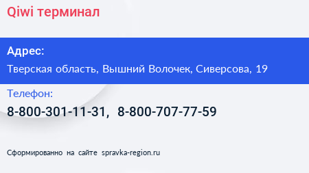 Qiwi, терминал по адресу Тверская область, Вышний Волочек, Сиверсова, 19 в дальнейшем Организация, размещена в следующих категориях: