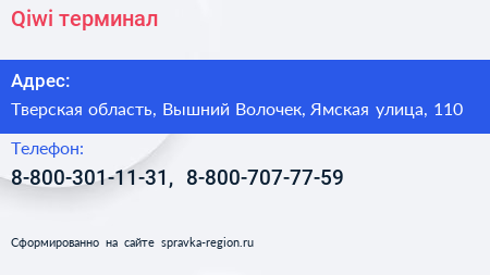 Qiwi, терминал по адресу Тверская область, Вышний Волочек, Ямская улица, 110 в дальнейшем Организация, размещена в следующих категориях: