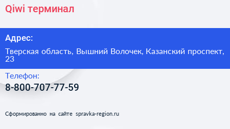Qiwi, терминал по адресу Тверская область, Вышний Волочек, Казанский проспект, 23 в дальнейшем Организация, размещена в следующих категориях: