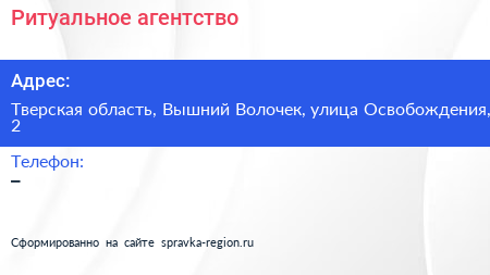 Ритуальное агентство по адресу Тверская область, Вышний Волочек, улица Освобождения, 2 в дальнейшем Организация, размещена в следующих категориях:
