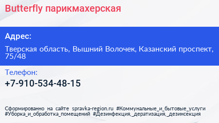 Butterfly, парикмахерская по адресу Тверская область, Вышний Волочек, Казанский проспект, 75/48 в дальнейшем Организация, размещена в следующих категориях:
