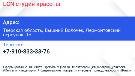 LCN, студия красоты по адресу Тверская область, Вышний Волочек, Лермонтовский переулок, 16 в дальнейшем Организация, размещена в следующих категориях: