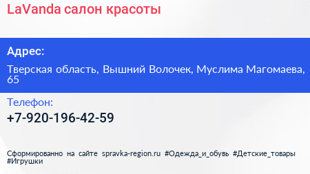 LaVanda, салон красоты по адресу Тверская область, Вышний Волочек, Муслима Магомаева, 65 в дальнейшем Организация, размещена в следующих категориях: