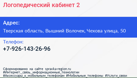 Логопедический кабинет №2 по адресу Тверская область, Вышний Волочек, Чехова улица, 50 в дальнейшем Организация, размещена в следующих категориях: