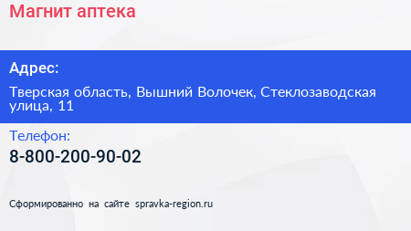 Магнит, аптека по адресу Тверская область, Вышний Волочек, Стеклозаводская улица, 11 в дальнейшем Организация, размещена в следующих категориях: