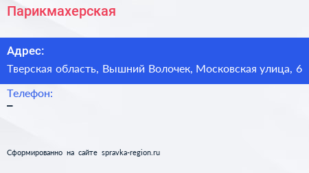 Парикмахерская по адресу Тверская область, Вышний Волочек, Московская улица, 6 в дальнейшем Организация, размещена в следующих категориях: