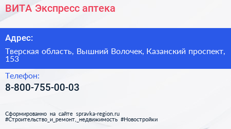 ВИТА Экспресс, аптека по адресу Тверская область, Вышний Волочек, Казанский проспект, 153 в дальнейшем Организация, размещена в следующих категориях: