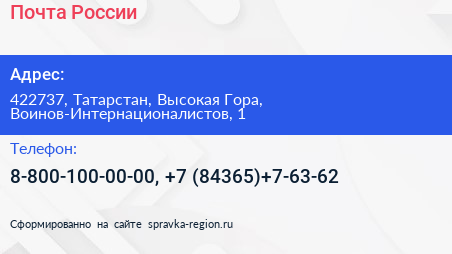 Почта России по адресу 422737, Татарстан, Высокая Гора, Воинов-Интернационалистов, 1 в дальнейшем Организация, размещена в следующих категориях: