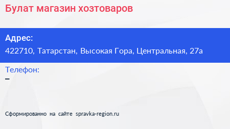 Булат, магазин хозтоваров по адресу 422710, Татарстан, Высокая Гора, Центральная, 27а в дальнейшем Организация, размещена в следующих категориях: