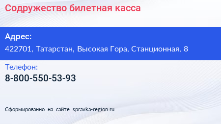 Содружество, билетная касса по адресу 422701, Татарстан, Высокая Гора, Станционная, 8 в дальнейшем Организация, размещена в следующих категориях: