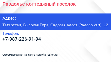 Раздолье, коттеджный поселок по адресу Татарстан, Высокая Гора, Садовая аллея (Радово снт), 12 в дальнейшем Организация, размещена в следующих категориях: