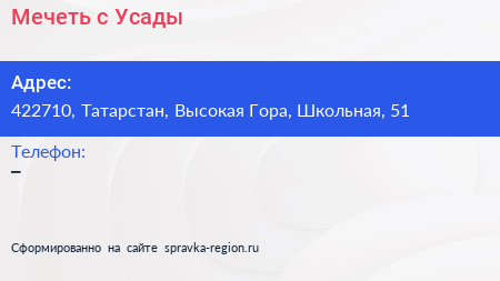 Мечеть, с. Усады по адресу 422710, Татарстан, Высокая Гора, Школьная, 51 в дальнейшем Организация, размещена в следующих категориях: