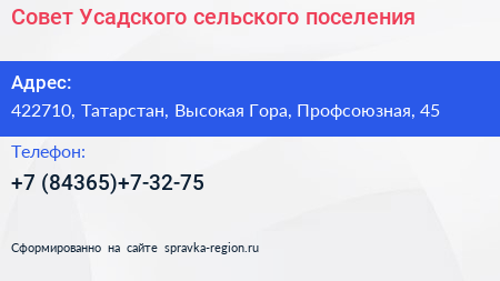 Совет Усадского сельского поселения по адресу 422710, Татарстан, Высокая Гора, Профсоюзная, 45 в дальнейшем Организация, размещена в следующих категориях: