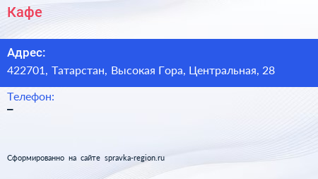 Кафе по адресу 422701, Татарстан, Высокая Гора, Центральная, 28 в дальнейшем Организация, размещена в следующих категориях: