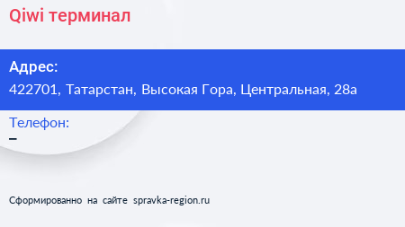 Qiwi, терминал по адресу 422701, Татарстан, Высокая Гора, Центральная, 28а в дальнейшем Организация, размещена в следующих категориях: