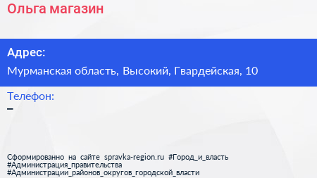 Ольга, магазин по адресу Мурманская область, Высокий, Гвардейская, 10 в дальнейшем Организация, размещена в следующих категориях: