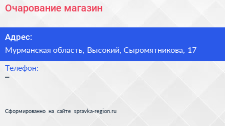 Очарование, магазин по адресу Мурманская область, Высокий, Сыромятникова, 17 в дальнейшем Организация, размещена в следующих категориях: