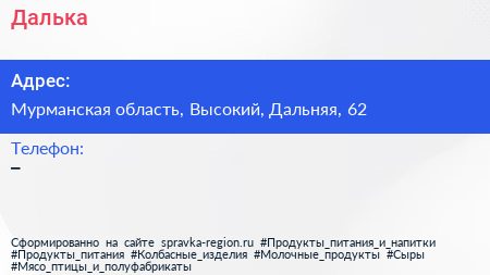 Далька по адресу Мурманская область, Высокий, Дальняя, 62 в дальнейшем Организация, размещена в следующих категориях: