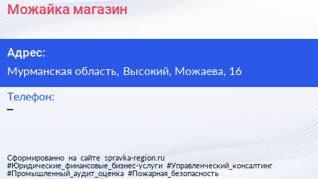 Можайка, магазин по адресу Мурманская область, Высокий, Можаева, 16 в дальнейшем Организация, размещена в следующих категориях: