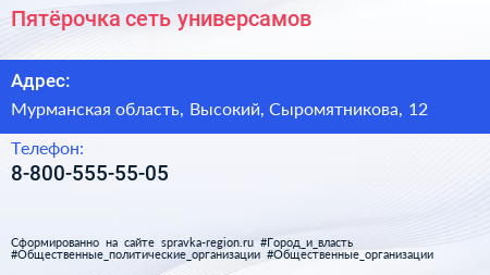 Пятёрочка, сеть универсамов по адресу Мурманская область, Высокий, Сыромятникова, 12 в дальнейшем Организация, размещена в следующих категориях: