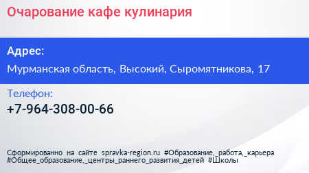 Очарование, кафе-кулинария по адресу Мурманская область, Высокий, Сыромятникова, 17 в дальнейшем Организация, размещена в следующих категориях: