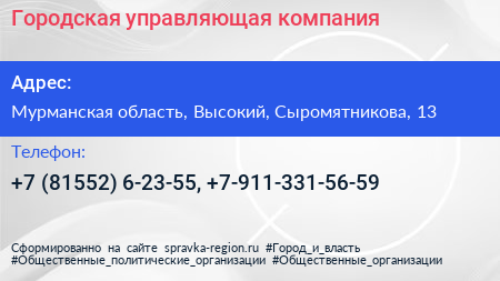 Городская управляющая компания по адресу Мурманская область, Высокий, Сыромятникова, 13 в дальнейшем Организация, размещена в следующих категориях: