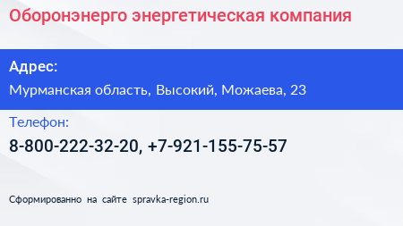 Оборонэнерго, энергетическая компания по адресу Мурманская область, Высокий, Можаева, 23 в дальнейшем Организация, размещена в следующих категориях: