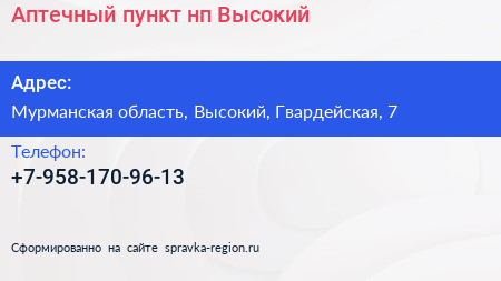 Аптечный пункт, нп. Высокий по адресу Мурманская область, Высокий, Гвардейская, 7 в дальнейшем Организация, размещена в следующих категориях: