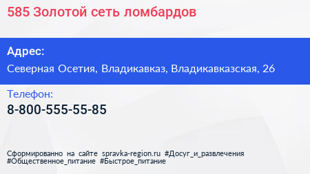 585*Золотой, сеть ломбардов по адресу Северная Осетия, Владикавказ, Владикавказская, 26 в дальнейшем Организация, размещена в следующих категориях: