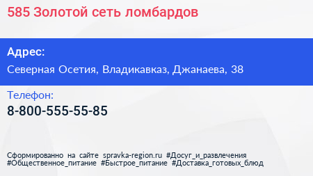 585*Золотой, сеть ломбардов по адресу Северная Осетия, Владикавказ, Джанаева, 38 в дальнейшем Организация, размещена в следующих категориях: