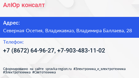 АлЮр консалт по адресу Северная Осетия, Владикавказ, Владимира Баллаева, 28 в дальнейшем Организация, размещена в следующих категориях: