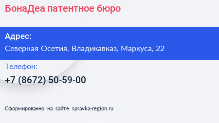 БонаДеа, патентное бюро по адресу Северная Осетия, Владикавказ, Маркуса, 22 в дальнейшем Организация, размещена в следующих категориях: