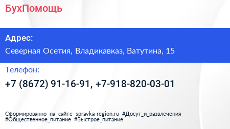 БухПомощь по адресу Северная Осетия, Владикавказ, Ватутина, 15 в дальнейшем Организация, размещена в следующих категориях: