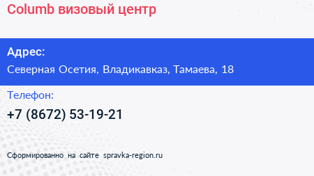 Columb, визовый центр по адресу Северная Осетия, Владикавказ, Тамаева, 18 в дальнейшем Организация, размещена в следующих категориях: