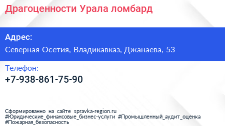 Драгоценности Урала, ломбард по адресу Северная Осетия, Владикавказ, Джанаева, 53 в дальнейшем Организация, размещена в следующих категориях: