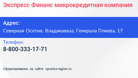 Экспресс Финанс, микрокредитная компания по адресу Северная Осетия, Владикавказ, Генерала Плиева, 17 в дальнейшем Организация, размещена в следующих категориях: