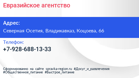 Евразийское агентство по адресу Северная Осетия, Владикавказ, Коцоева, 66 в дальнейшем Организация, размещена в следующих категориях:
