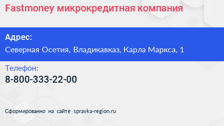 Fastmoney, микрокредитная компания по адресу Северная Осетия, Владикавказ, Карла Маркса, 1 в дальнейшем Организация, размещена в следующих категориях: