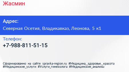 Жасмин по адресу Северная Осетия, Владикавказ, Леонова, 5 к1 в дальнейшем Организация, размещена в следующих категориях: