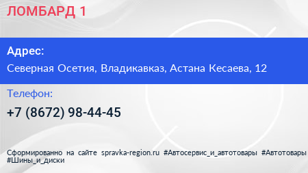 ЛОМБАРД №1 по адресу Северная Осетия, Владикавказ, Астана Кесаева, 12 в дальнейшем Организация, размещена в следующих категориях: