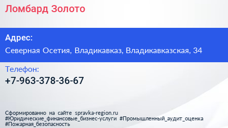 Ломбард-Золото по адресу Северная Осетия, Владикавказ, Владикавказская, 34 в дальнейшем Организация, размещена в следующих категориях: