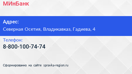 МИнБанк по адресу Северная Осетия, Владикавказ, Гадиева, 4 в дальнейшем Организация, размещена в следующих категориях: